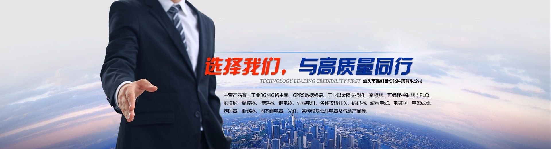 汕頭市福創(chuàng)自動化科技有限公司是一家集自動化元件的代理銷售與維修、自動化設(shè)備設(shè)計制造、自動化工程安裝改造、機(jī)電工程安裝改造、自動化機(jī)械設(shè)備設(shè)計與制造的企業(yè)。 主營產(chǎn)品有:工業(yè)3G/4G路由器、GPRS數(shù)據(jù)終端、工業(yè)以太網(wǎng)交換機(jī)、變頻器、可編程控制器(PLC)、觸摸屏、溫控器、傳感器、繼電器、伺服電機(jī)、各種按鈕開關(guān)、編碼器、編程電纜、電磁閥、電磁線圈、定時器、斷路器、固態(tài)繼電器、光纖、各種模塊低壓電器及氣動產(chǎn)品等。